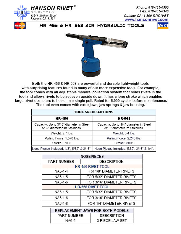 - Capacity: Up to 1/4” in all materials standard, structural & closed end blind rivets. Will also set Lockbolts up to 3/16” (Nose Assembly sold separately).