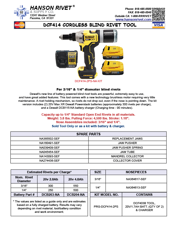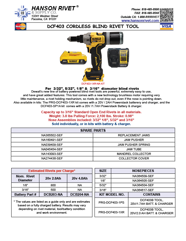 - Capacity: up to 3/16″ in all materials, standard and closed-end blind rivets.